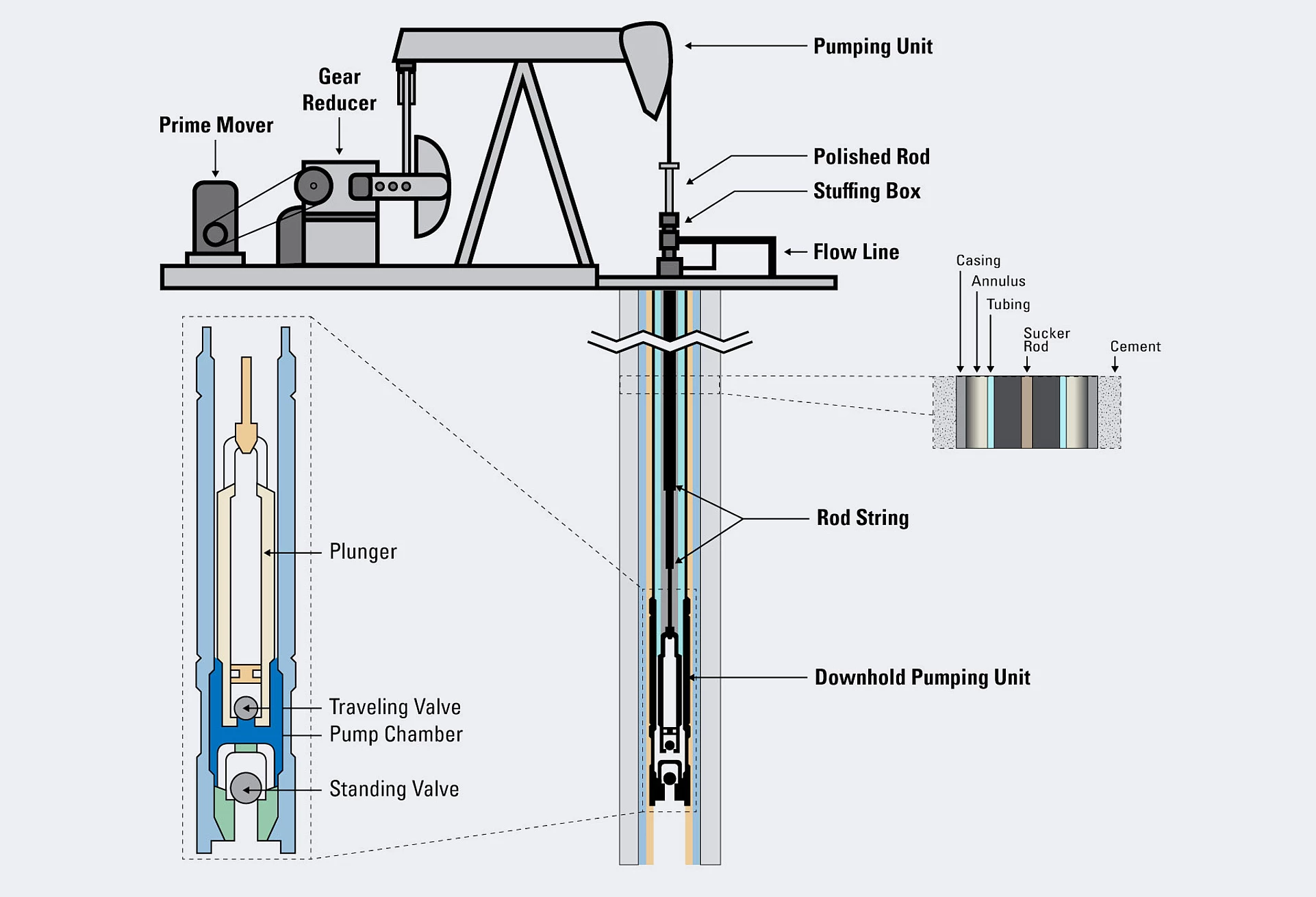 Nach Beendigung der Bohrphase wird das Bohrloch (Sonde) durch den Einbau eines Filterrohres (Casing) und eines Steigrohres (Tubing) im Bereich der Lagerstätte ausgerüstet. In der ersten Phase fließt das Erdöl im Idealfall aufgrund des natürlichen Lagerstättendrucks selbsttätig zu den Produktionssonden und gelangt so von selbst an die Erdoberfläche. Sinkt der Druck, ist der Einsatz zusätzlicher Techniken wie etwa des Gasliftverfahrens erforderlich, bei dem verdichtetes Gas in den Förderstrang eingepresst wird, woraufhin das aufwärtssteigende Gas das Gewicht der Flüssigkeitssäule vermindert und die Sonde weiterhin selbstständig fördern kann. Nach dieser sogenannten Eruptivphase werden, abhängig von den Eigenschaften des Erdöls, seinem Gehalt an Erdölgas und den jeweiligen Druckverhältnissen, unterschiedliche Pumptechniken eingesetzt. Bei geringem Gasgehalt des Erdöls und sinkenden Druckverhältnissen übernehmen in die Sonde eingebaute Tiefpumpen den Transport. An der Erdoberfläche ist nur der Antrieb, der typische Pferdekopf, zu sehen. Bei hohen Förderraten werden elektrische Tauchkreiselpumpen in die Sonde eingebaut.